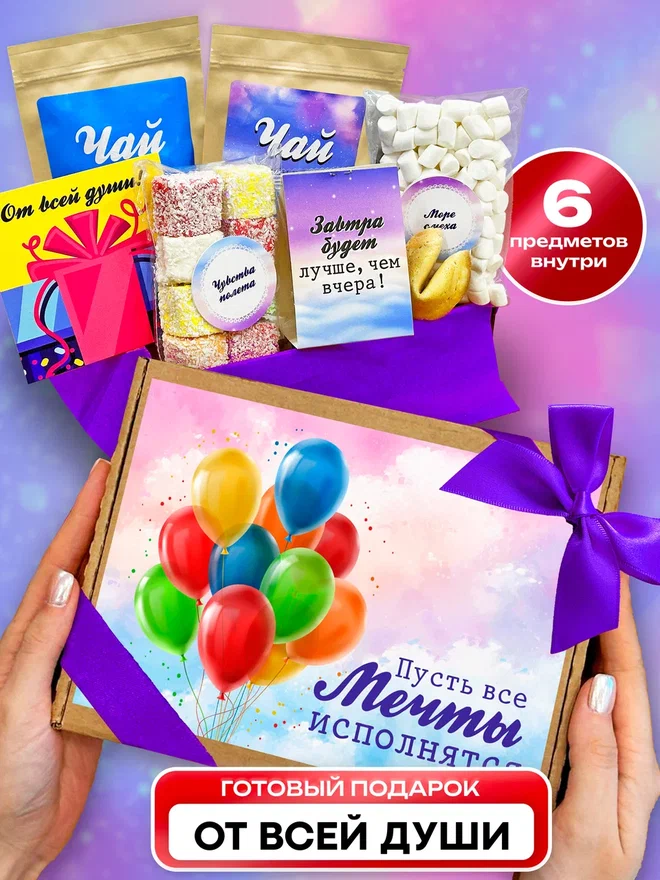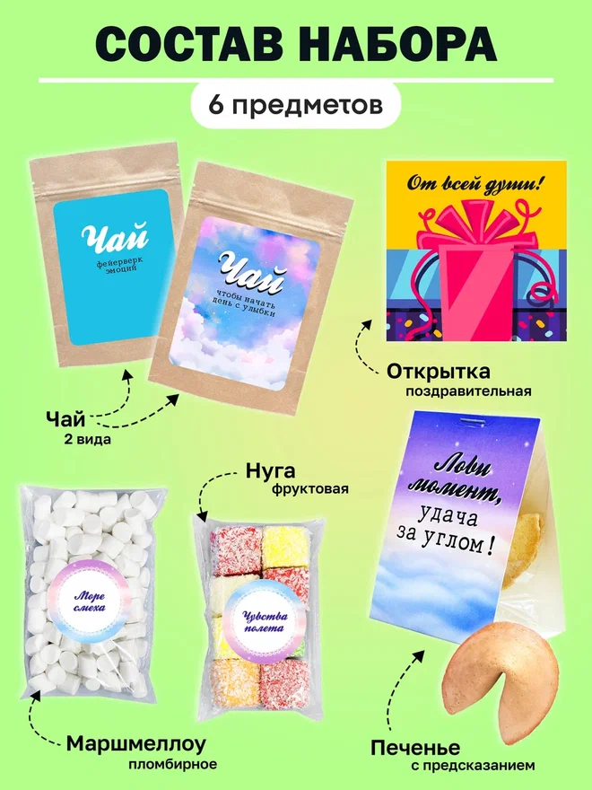 В набор входят: 2 вида чая, нуга, печенье с предсказанием, маршлеллоу, мини карточка открытка.