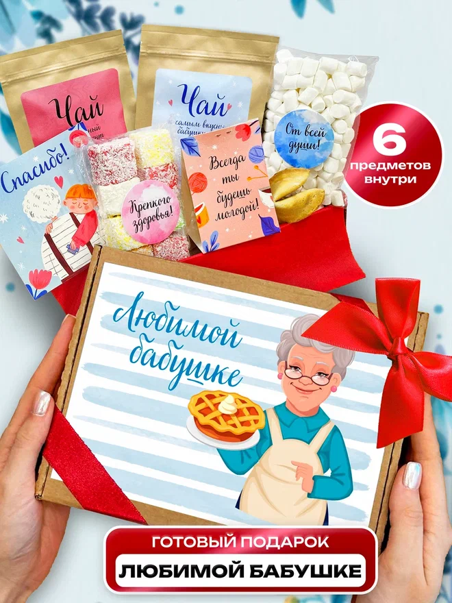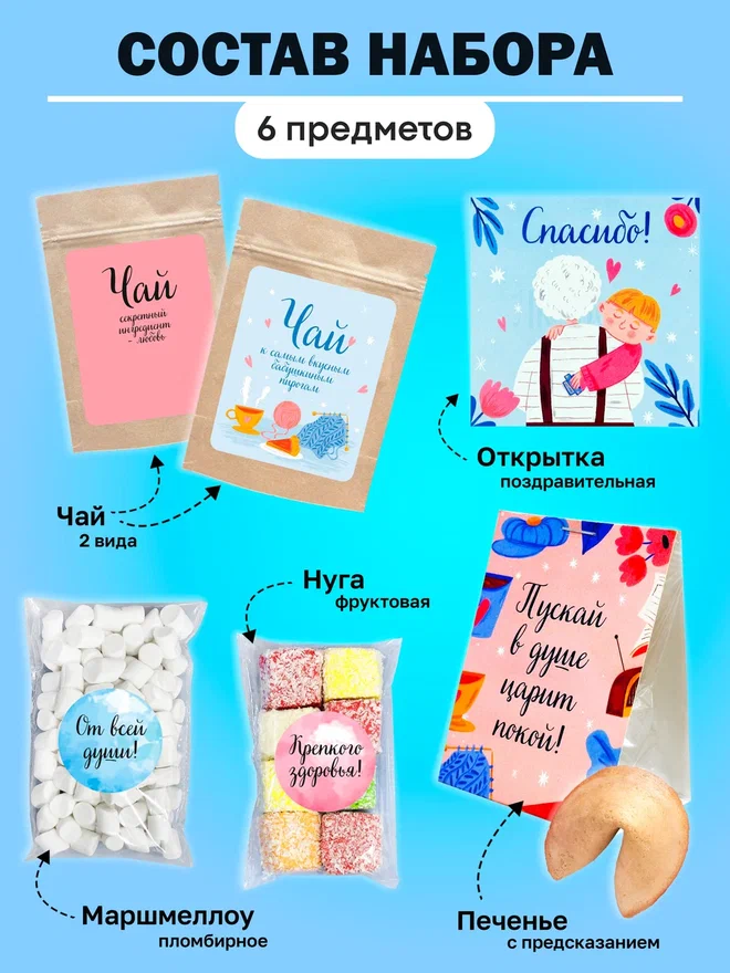 В набор входят: 2 вида чая, нуга, печенье с предсказанием, маршлеллоу, мини карточка открытка.