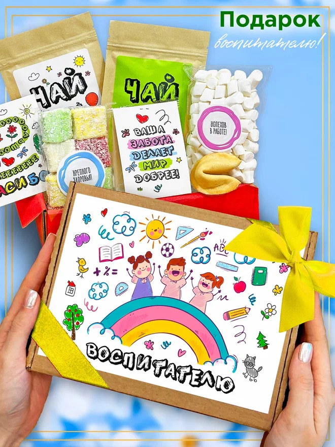 В набор входят: 2 вида чая, нуга, печенье с предсказанием, маршлеллоу, мини карточка открытка.