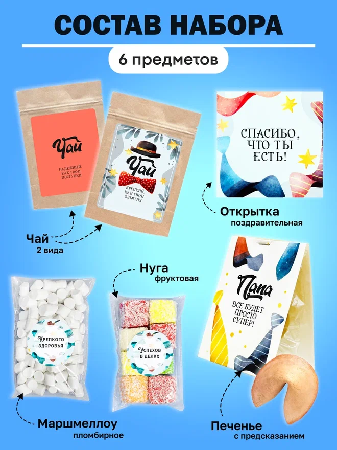 В набор входят: 2 вида чая, нуга, печенье с предсказанием, маршлеллоу, мини карточка открытка.