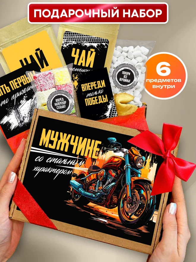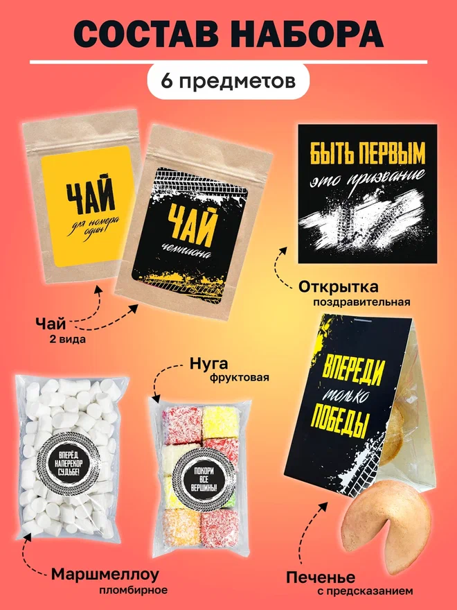 В набор входят: 2 вида чая, нуга, печенье с предсказанием, маршлеллоу, мини карточка открытка