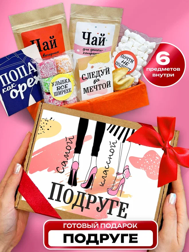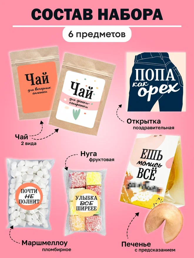 В набор входят: 2 вида чая, нуга, печенье с предсказанием, маршлеллоу, мини карточка открытка
