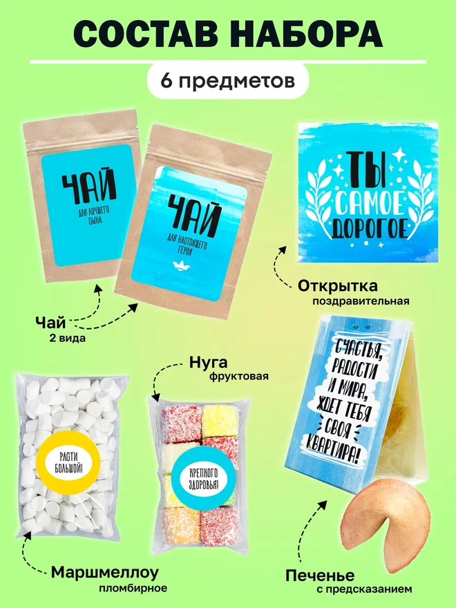 В набор входят: 2 вида чая, нуга, печенье с предсказанием, маршлеллоу, мини карточка открытка